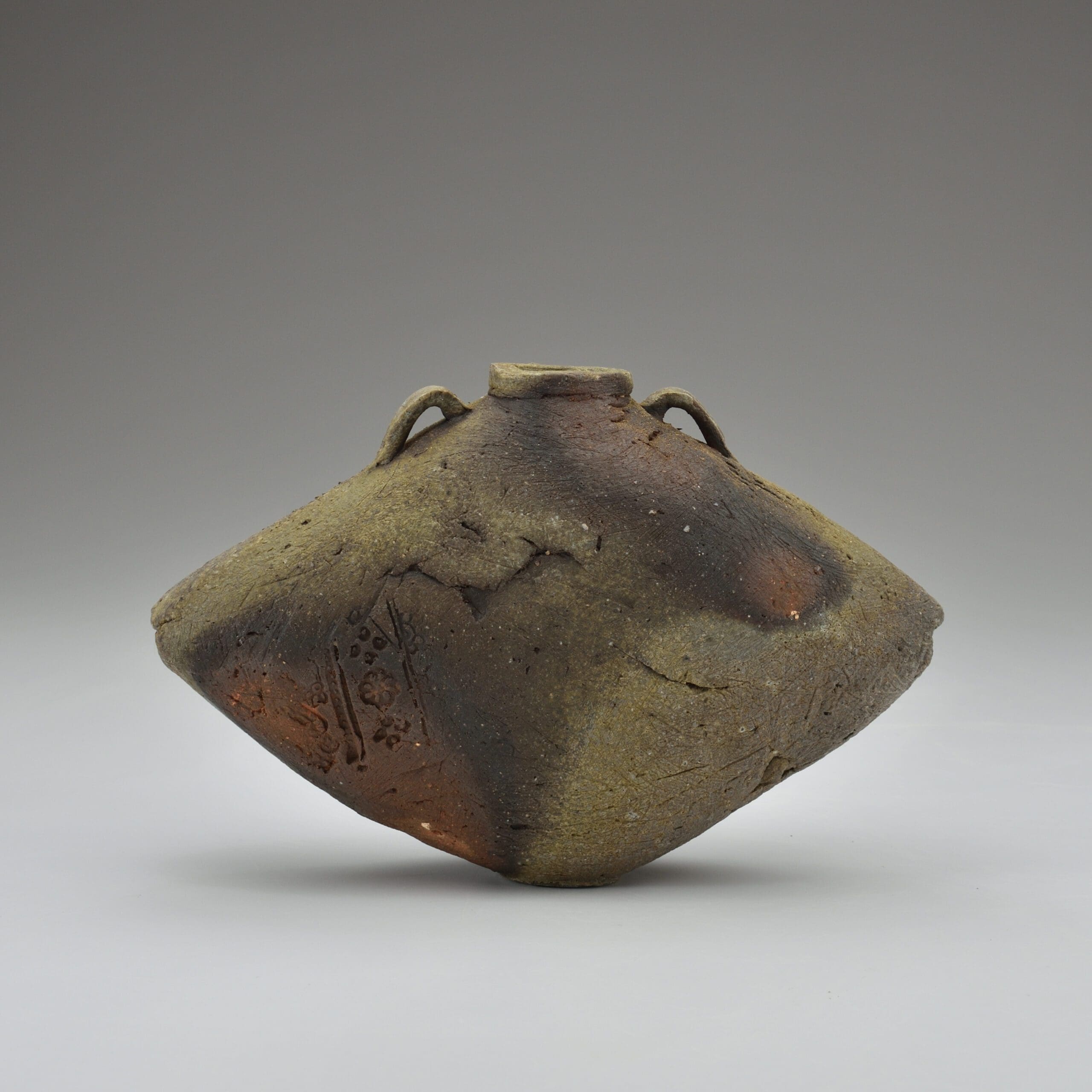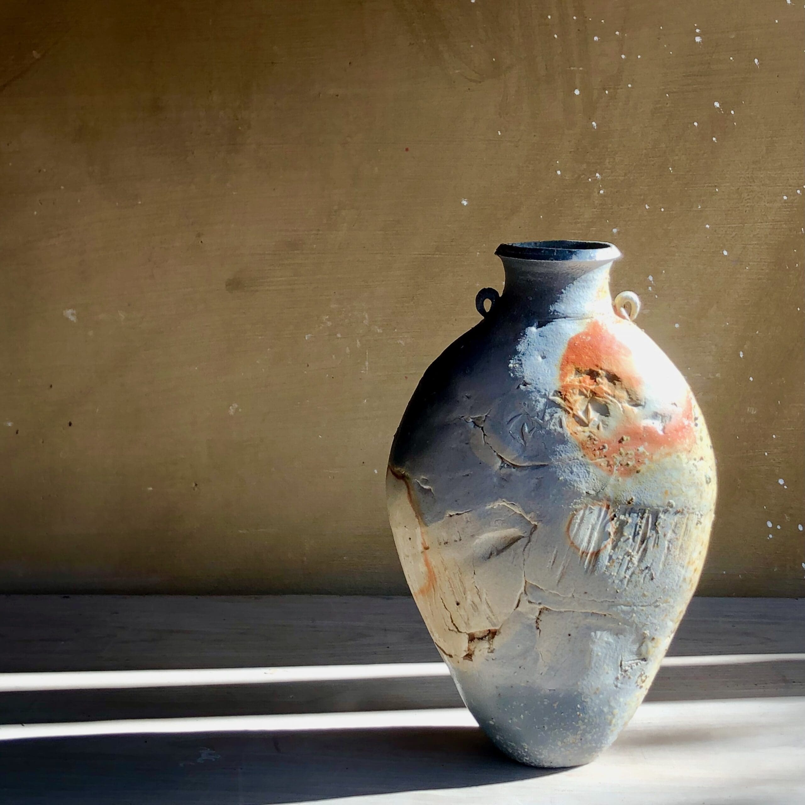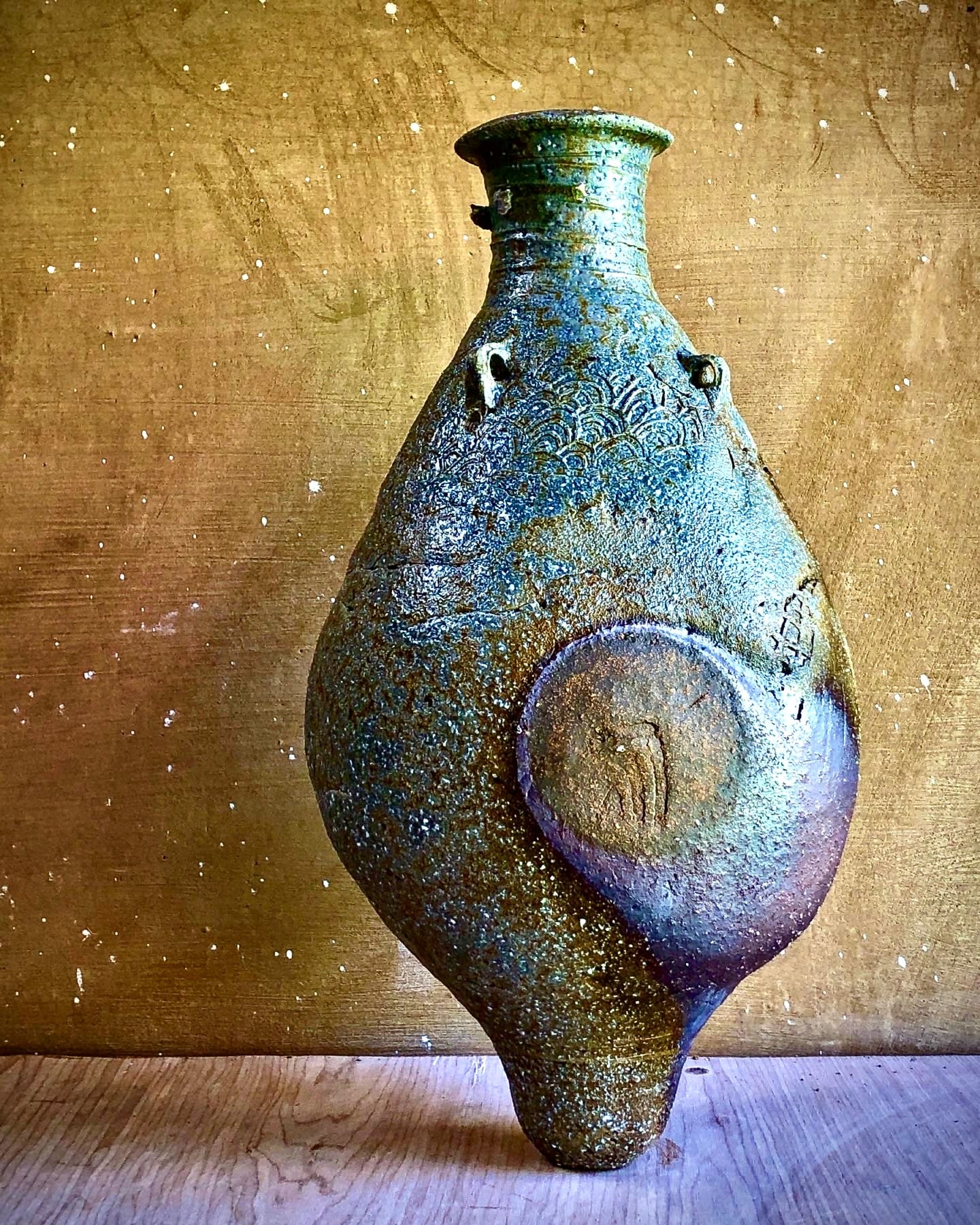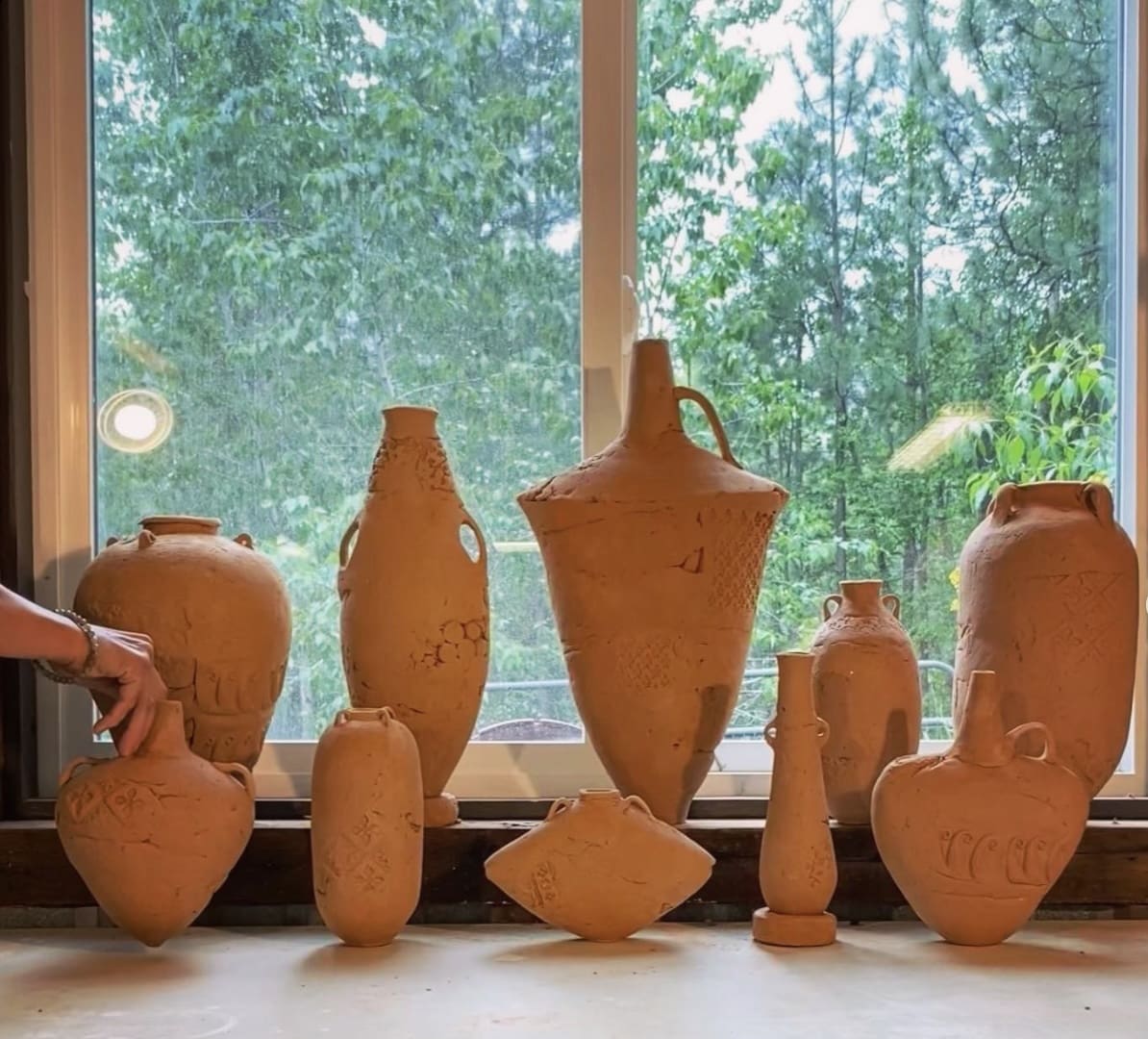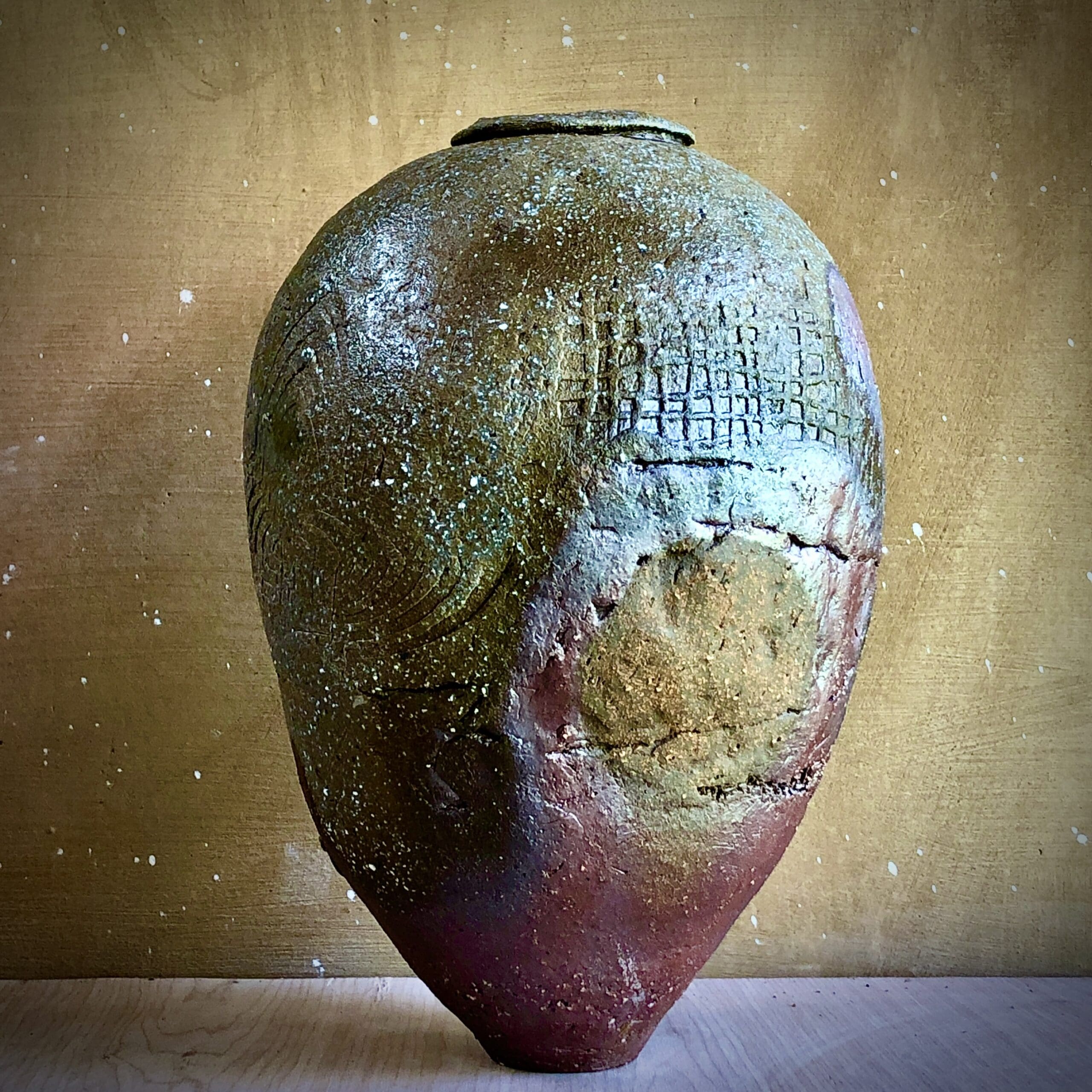Eva’s intuitive hand building method creates 3 dimensional “canvases” upon which to explore multiple techniques for mark making, printing, adding depth and texture— in effect, telling a visual story across the surface of each vessel, and then offering these highly expressive works to the new wood kiln, allowing it to have the final word in design.