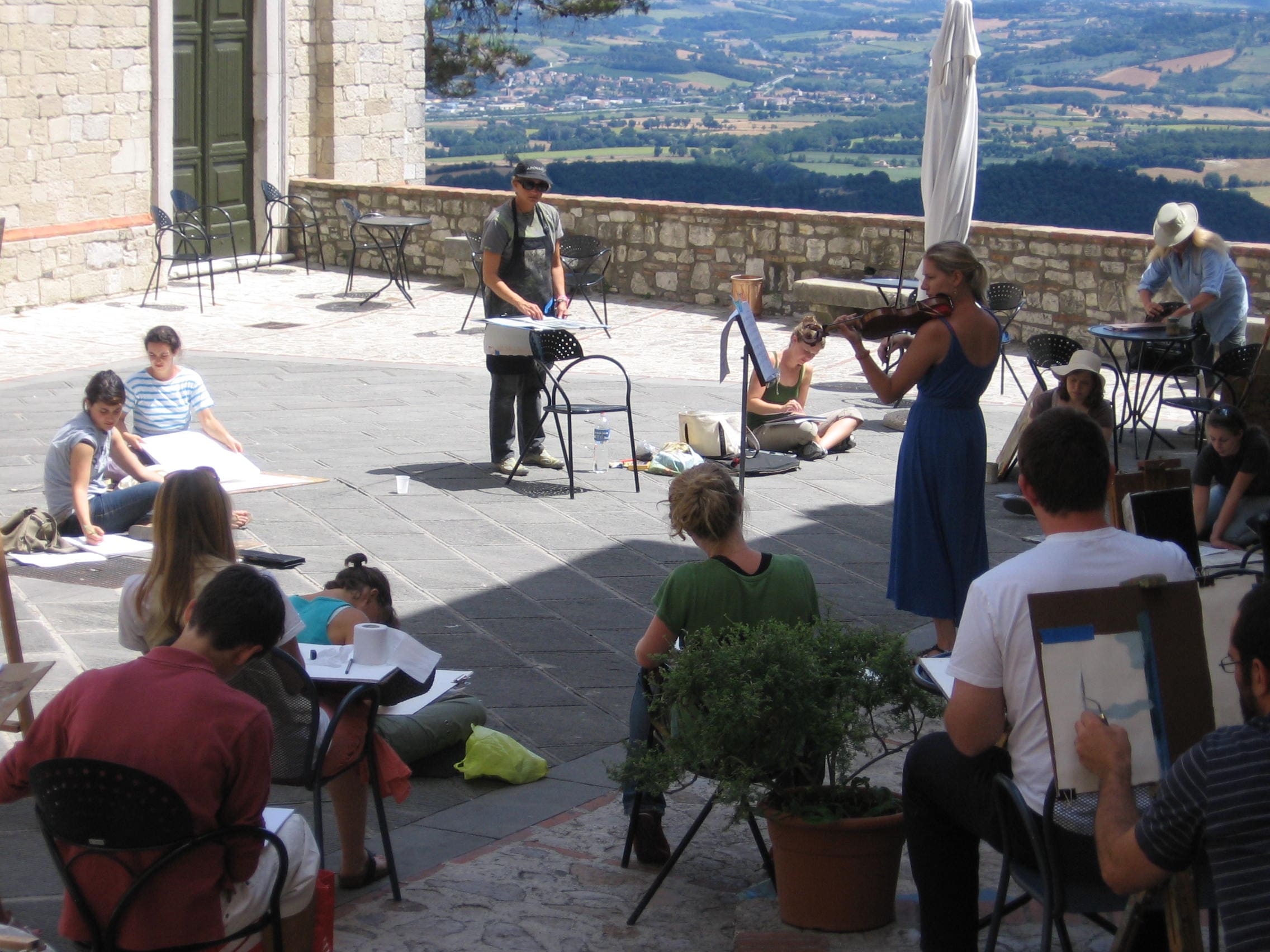 Monte Castello is a traditional village. With fewer than 2000 inhabitants, including those living outside of the village in the surrounding countryside, the rhythm of daily life in Monte Castello goes on as it has for generations. The people of Monte Castello are friendly and helpful to students, and welcome them with open arms. It is a source of great civic pride that visitors come from all over the world to experience their little community. There is much in Monte Castello to interest visitors––with mountaintop cities such as Todi or Assisi perched nearby, panoramas of the of the Tiber River Valley and glimpses of the snowcapped Sybillini mountains in the distance, visitors have spectacular 360 degree views from any point in the town.
