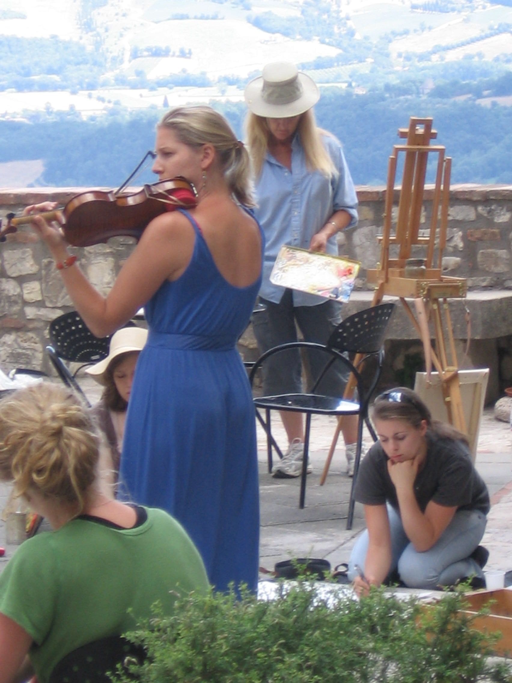 At the close of the session, participants have the option of participating in a public presentation of their work, a performance of their projects, a reading of their work, or a presentation. This provides participants an important professional-development opportunity to participate in a public exhibition/performance/reading in Europe attended by an exceptionally well-informed audience. Exhibitions are held in our In Bocca al Lupo gallery, final performances and readings, discussions, and presentations in the Teatro Concordia. And the central piazza overlooking the Tiber valley. These events are well attended by the community at the school and by residents of the village and region. Each event features a fully catered reception with wine and other beverages as well as light snacks prepared by our kitchen staff. The sale of work by artists is permitted and encouraged without commission.