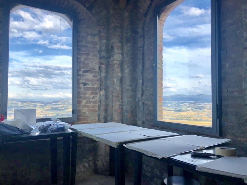 All program participants in the 2-D areas of visual arts are provided with private or semi-private studio space in the spectacular 14th c palazzo that houses our Studio Building. These are available on a 24/7 basis. Here, we accommodate individual artists' needs with the appropriate size and location of studio spaces. Through our application form, we determine your needs taking into consideration factors such as natural or artificial light, wall or table space, or even if you prefer a space with a view or one of our cooler, more atmospheric interior spaces.